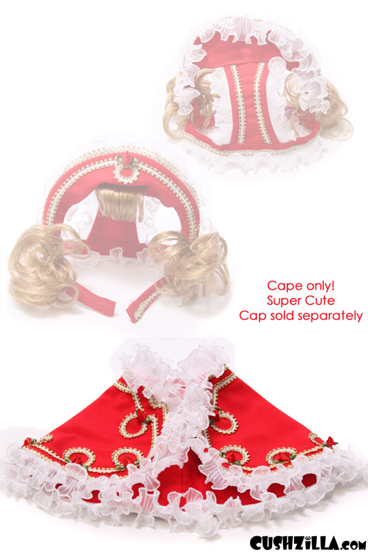 Prince Charming Costume for Cats / Costume for Dogs - CAPE ONLY. Prince Charming Bonnet comes separately if you want to complete the Prince Charming cat costume / dog costume. A red cape fit for a prince or princess: red base with white ruffled white lace edge and gold decorative trim, topped with tiny satin red roses with green leaves. It's the world's most majestic dog / kitty costume, and it was made by the Queen of Cat Costumes: Cat Prin. These amazingly intricate dog and cat costumes are completely handmade in Japan, and then shipped to the US. They are limited stock collector's items and we are very happy to be the first (and currently only) retailer in the United States that offers the Cat Prin pet costumes. Again, this is the cape only. You will need to purchase the hat separately if you would like the complete costume. Fits necks 27cm (about 11 inches) and under. See our size guide in the right-hand menu under the Add to Cat button for measuring guidance. Best to be a little large than too small. Refer to our size chart, and when in doubt call before purchase!